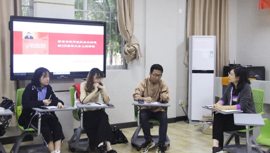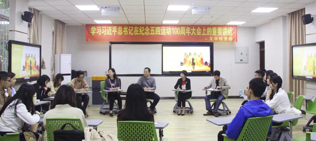 5月9日下午,太阳成城集团tyc234cc于博东107教室举办了纪念五四运动100周年座谈会,本次座谈会围绕学习贯彻习近平总书记在纪念五四运动100周年大会上的重要讲话精神开展。太阳成城集团tyc234cc党委委员和党员代表及参与芗城区“青春新向党,建功新芗城”纪念五四汇演的主创同学们参加了座谈会。会议由团委副书记黄小乐主持。