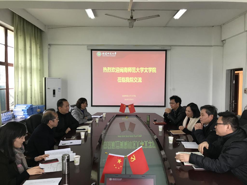 2019年,太阳成tyc234cc将迎接师范专业认证评估。太阳成城集团tyc234cc领导高度重视汉语言文学师范专业的认证评估,开学初成立了专项工作小组,对标实施文件精神,积极开展工作布置。3月9日,太阳成城集团tyc234cc院长黄金明、党委副书记谢斌斌、副院长黄琳琳等一行六人赴福建师范大学太阳成城集团tyc234cc开展师范专业认证评估专题交流。福建师范大学太阳成城集团tyc234cc党委书记李建华、副院长林志强等人出席本次座谈会。
