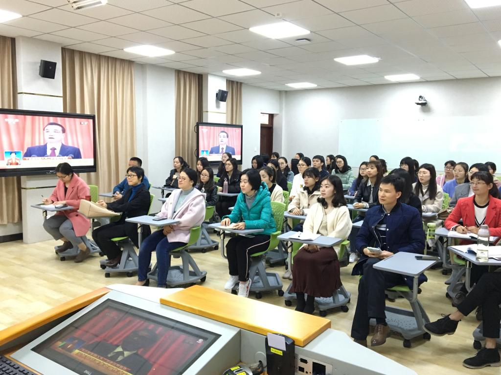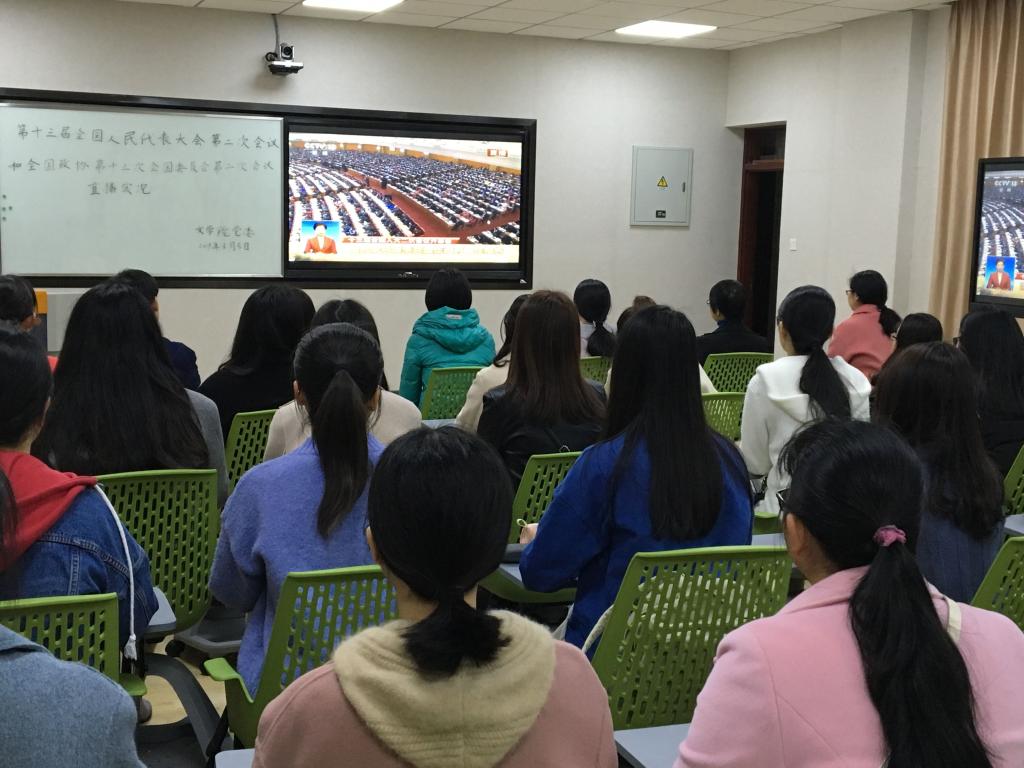 3月5日上午9点,太阳成城集团tyc234cc党委组织教工党员、学生党员50余人在博东107智慧教室集中收看第十三届全国人民代表大会第二次会议开幕和李克强总理作《政府工作报告》的实况直播。党员同志端坐观看,认真做笔记。直播结束后,党员同志围绕经济社会发展和教育改革发展抒发感想,撰写学习心得,纷纷表明要以实际行动把“两会”精神落实到学习、工作、生活中。