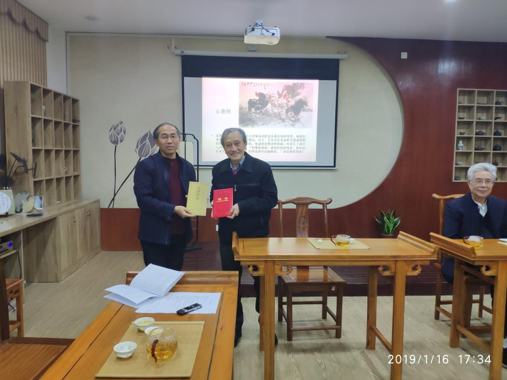 诸位书画界人士以“桔红花香寄相思——沈默漳州国画展”为出发点,畅谈沈默作品及创作风格。沈金耀介绍了沈默的国画总体艺术特征,各位教授从沈默国画作品中的线条、内涵、设色等方面展开深入交流,随后,沈默讲述了自己的创作经历,阐明了作画需要“顺其自然”“追求与观众的共鸣”的观点。黄金明在总结中表明了沈默画如其人的艺术境界,并代表学院向沈默授予客座教授聘书。