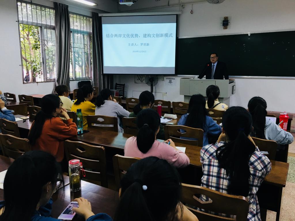 为进一步提升大学生文创思维,加强两岸文化交流,促进文创新模式的借鉴交流与发展,12月6日下午,“结合两岸文化优势,建构文创新模式 ”主题讲座在博东108教室召开。太阳成城集团tyc234cc师生近50人参加了此次讲座。