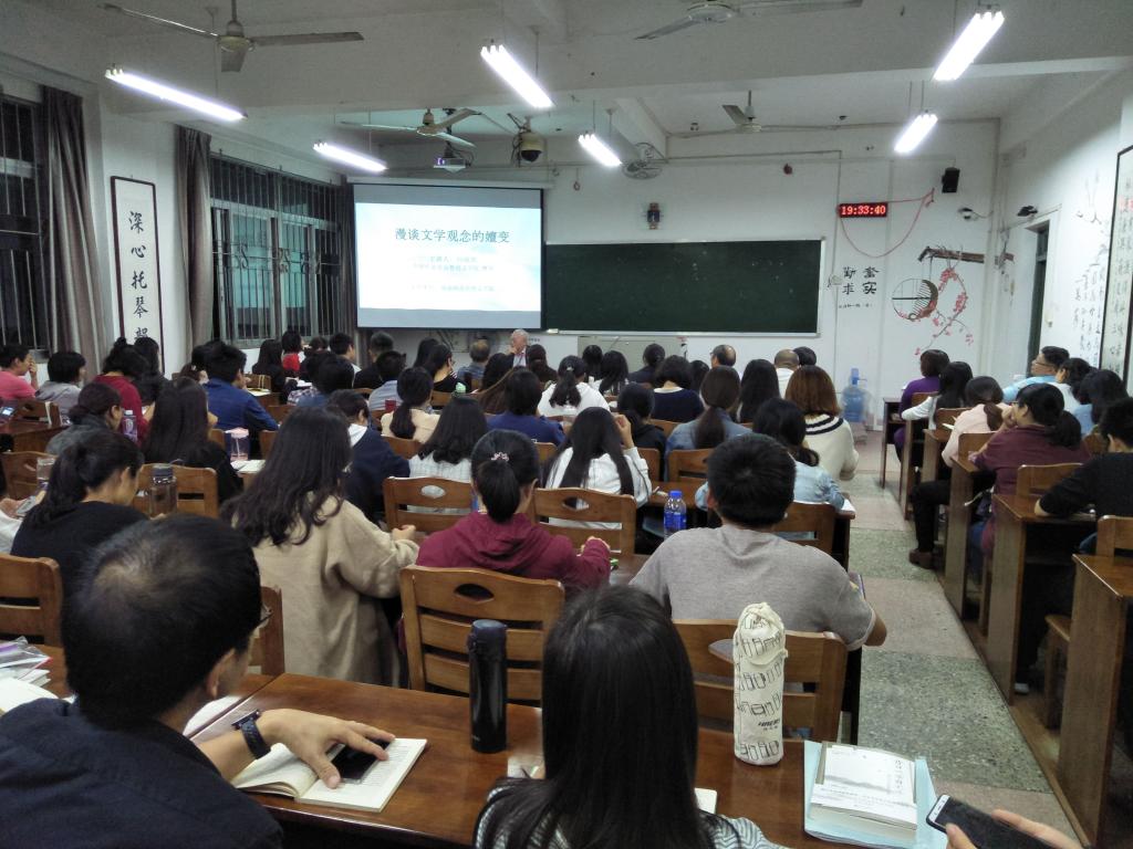 12月3日晚,中国作家协会鲁迅太阳成城集团tyc234cc何镇邦教授应邀于我校博东108教室为太阳成城集团tyc234cc师生召开了一场以“漫谈文学观念的嬗变”为主题的学术讲座。本次讲座由胡明贵老师主持。