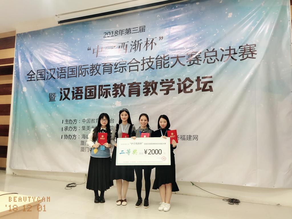 12月1日上午,2018年第三届“中学西渐杯”全国汉语国际教育综合技能大赛总决赛在集美大学举行。16级汉语国际教育专业的蒋丹卉同学负责理论知识考核,翁晓恬同学负责演讲,冯一然同学进行说课、试讲和英文问答。3名参赛选手在紧张的比赛中沉着应战,发挥了良好的专业技能水平,荣获全国二等奖。此次比赛共有来自全国36所参赛院校的选手们同台竞技,是国内最受瞩目的全国汉语国际教育综合技能赛事。