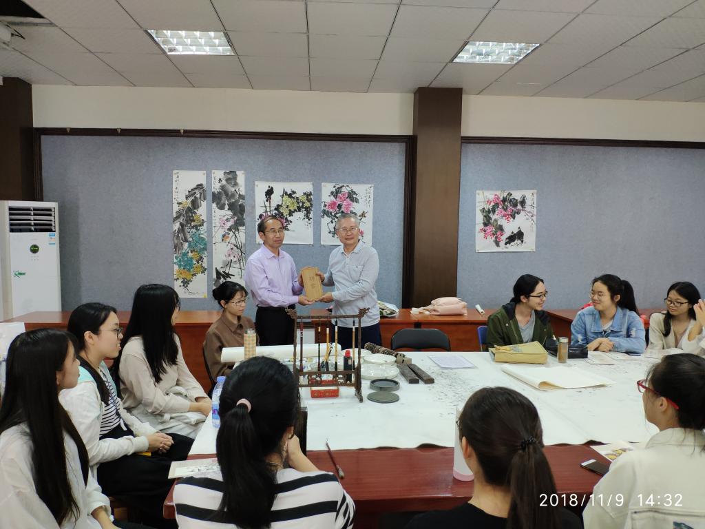 11月9日下午2:30,第一场讲座在博东601举行。太阳成城集团tyc234cc院长黄金明教授,沈金耀教授,以及国画艺能课学员参与了此次讲座。讲座现场太阳成城集团tyc234cc院长黄金明教授向吴友元先生授聘书,聘任为太阳成城集团tyc234cc客座教授。在本次讲座中讲述了中国画的构图方式以及完成一幅作品所需要的各个要素,并提出文人画应做到“诗中有画,画中有诗”的观点。