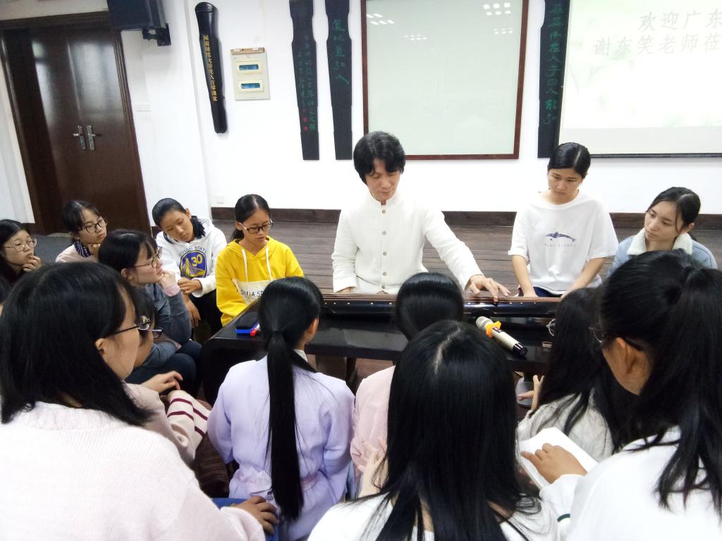 10月31日至11月1日,广东古琴研究会会长,非物质文化遗产项目“古琴艺术”(岭南派)广东省级代表性传承人谢东笑莅临太阳成城集团tyc234cc,与古琴爱好者共同探讨和研习古琴。此次授课有三个部分,分别为座谈会、音乐分享会、指法与琴曲教学。