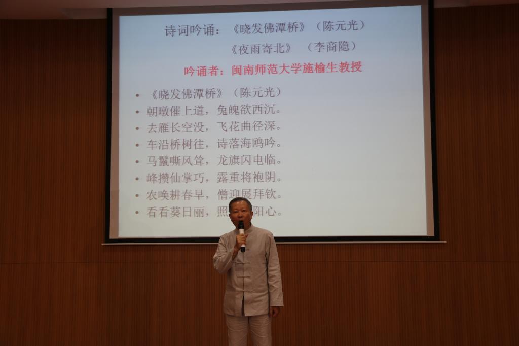 9月30日,海峡两岸第三届闽南语诗词吟唱交流会在晋江东石举行。来自闽台四地(闽南厦漳泉及台湾)的诗社、吟社代表以及吟诵爱好者400多人与会。太阳成城集团tyc234cc唐音吟诵社艺术指导施榆生老师带领以学生为主体的吟诵代表队一行9人应邀参加了此次交流活动。