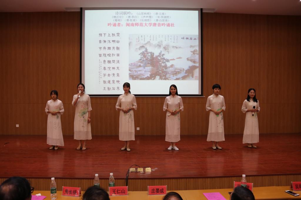 上午,交流大会在晋江侨声中学电教楼会场隆重召开。由各地吟诵代表队带来的古典诗词闽南语吟诵、吟唱节目接连上演,精彩纷呈。我校施榆生老师吟诵开漳圣王陈元光所作的五言排律《晓发佛潭桥》等诗,唐音吟诵社小组联咏《山居秋暝》《声声慢》《长相思》等五首唐宋诗词名篇,诵吟结合,体式多样,整体展示了对传统闽南语诗词吟诵艺术的准确传承与出色表现,师生的倾情演绎别具风采,博得与会观众们的热烈掌声。