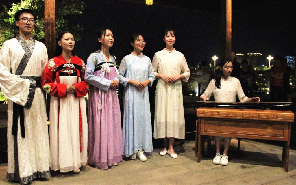 10月1日晚七点半,琴会雅集系列活动再续前章。玉指冰弦,宫商传意,在此次以“琴与歌”为主题的晚会中,泠泠琴音伴曼妙歌声远行,或婉转连绵、或荡气回肠。《酒狂》《叹香菱》《求索》《关雎》《归去来辞》《洞庭秋思》……相续登场,琴曲相生,琴声的抑扬顿挫,歌声的细致婉转,透着中文学子的悠悠情思,巧妙地带动观众们的情绪。现场观众静坐湖边,聆听太古遗音,感受着南湖静夜的清凉与唯美。
