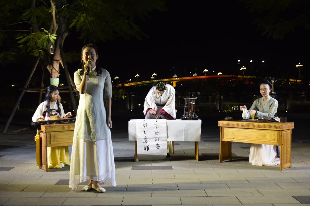 9月29日晚七点半,在清扬的琴声中,“琴与诗”主题演出渐渐拉开了帷幕。幽幽明月下,静坐弹素琴,悠长的古琴清音为林语堂的《浮生如梦》、《吾国与吾民》等节选片段的朗诵增添了雅兴;透过古琴低沉玄妙的声音,杨西北、李芊墨、潘琳等人将杨骚的《月彷徨》、《两个孩子》、《把梦拂开》的经典诗歌真情演绎;耳根得听琴初畅,心地忘机酒半酣,虽无樽酒与琴声相伴,现场却更有《水调歌头》中把酒问青天的雅致;江上调玉琴,一弦清一心,《水乡江南》、《青山慢》等诗歌伴着碧水,和着琴音把观众的精神洗涤;明净的月光伴着绵绵的琴音,一首首闽籍作家作品被太阳成城集团tyc234cc学子与社会知名人士朗朗吟诵。一场近距离的琴诗交流,品味传统文化的典雅之美,让观众享受到了当下心灵的平静祥和,琴声、吟诵声的碰撞与交融。