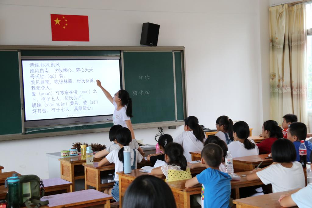 在经典诵读课程中,实践队的同学们讲授中华经典《诗经》中的《凯风》和《木瓜》,通过演讲音乐游戏等授课方式,让学生学习和理解其中所蕴藏的人生哲理和更深层的意蕴。而在《子衿》的课堂上,小朋友们诵读经典,吟唱经典,伴随着美妙的音乐,古诗新唱,让他们在学习中思考,在思考中成长,领略中国传统文化的魅力所在。国学经典的学习,既丰富了小朋友们的国学知识储备,又加深了他们对中国传统文化的认识,从而树立文化自信。