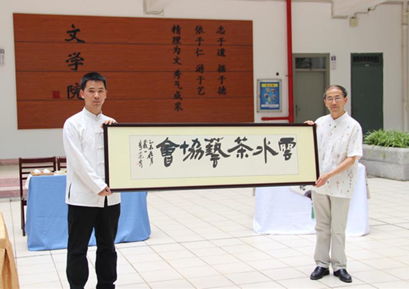 “云水茶艺协会是由台湾明道大学罗文玲教授命名,由著名书画家李宪专老师题名,诗人林焕彰、萧萧也分别赠诗,从院长手上接到这块沉甸甸的牌匾,我们的心情十分激动,希望有更多的同学共同参与进来”。茶协会长蒋德峰同学在茶会活动上说道。“四序茶会”表演结束后,宾主起立,师生们手拿品茗杯走近桌前,众手传盅,品茗活动随即展开。