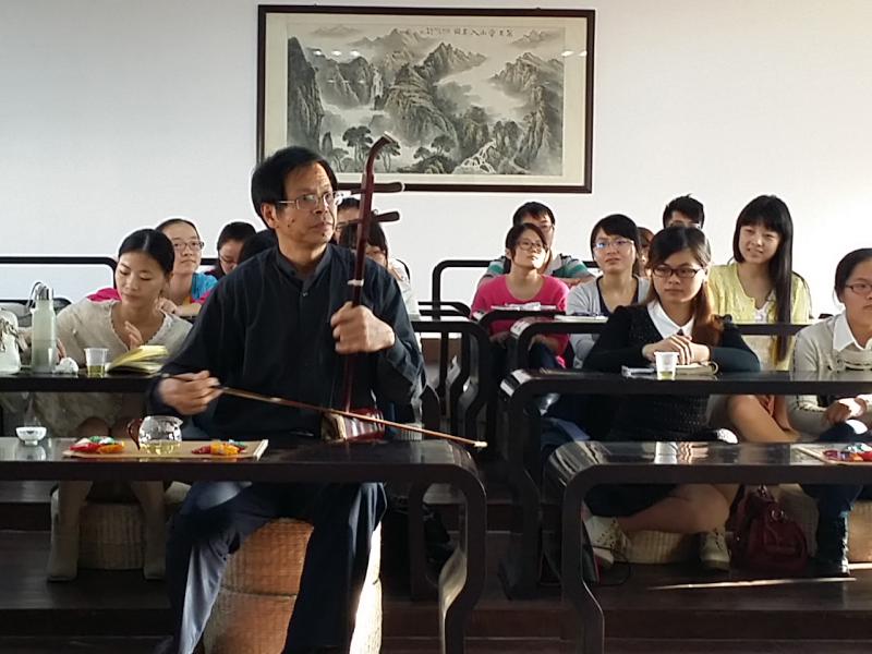 在品茶畅谈之余,胡教授还演唱了一首《叫我如何不想她》,沈教授用二胡进行伴奏,两位老师的声乐合奏、惊艳全场。王副教授也以一首红楼梦的《红豆曲》牵引着大家的思绪,望穿青山隐隐、绿水悠悠。