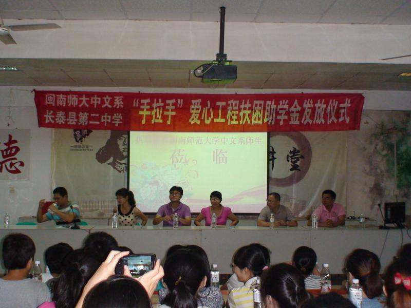 7月6日上午,中文系团委在长泰二中开展手拉手’爱心工程扶困活动”,举办了手拉手’爱心工程扶困助学金发放仪式”,资助长泰二中十六位家境贫困的学生,之后将在长泰二中开展为期四天的“实践激扬青春志 奋斗成就中国梦”为主题的社会实践活动。
