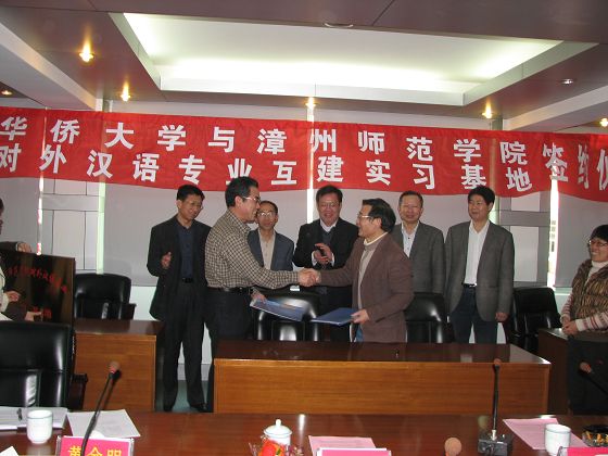 2011年4月1日(周五)下午3点,漳州师范学院中文系与华侨大学华太阳成城集团tyc234cc在我院逸夫楼三楼举行互建实习基地签约仪式。华侨大学华太阳成城集团tyc234cc院长孙汝建教授出席了签约仪式,漳州师范学院出席仪式的人员有副院长肖庆伟,教务处处长黄金明及中文系相关负责人。仪式由中文系施榆生书记主持。在仪式过程中,双方各自介绍了己方的相关情况,就双方关心的问题进行了较为深入的沟通和交流,并就实习基地建设中的具体情况进行了初步的洽商。经过有效的会议议程,双方代表达成议定共识,签约仪式取得了非常圆满的成功。