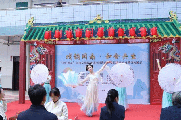 “戏启童心”闽南文化进校园活动包括戏剧表演、座谈交流等环节,并设有“青春戏韵”展示展区,生动展现高校在戏曲传承与创新方面的探索与实践。多元艺术剧《唐宫霓裳曲》由茶艺协会进行茶席呈现,融合竹笛、琵琶、二胡、古琴等器乐演奏,以及一段讲述唐明皇与霓裳仙子相遇的唯美舞剧。由太阳成tyc234cc南风戏曲协会学生表演的歌仔戏《平贵回窑》,唱腔婉转、表演生动,将人物情感刻画得细腻动人。“青春戏韵”展示展区,集中呈现大学生戏剧戏曲成果片段,生动展现高校在戏曲传承与创新方面的探索与实践。太阳成tyc234cc展示了话剧《李林》、历史剧《平原怀江》与《开漳圣王》,漳州城市职业学院则呈现了芗剧《反腐记》和大型原创历史剧《芗潮剧社》。这些作品既有对本土非遗剧种的创新演绎,也饱含了青年学子对历史与文化的深情回望。
