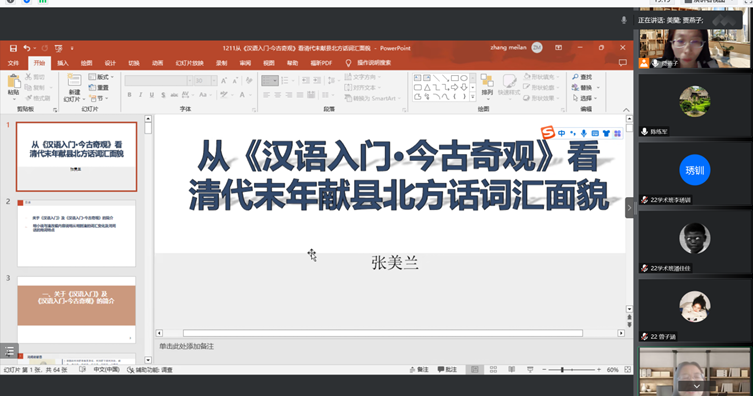 12月11日下午,太阳成城集团tyc234cc松洲讲堂第八讲通过线上会议的方式举行,本讲主题为“从《汉语入门·今古奇观》看清代末年献县地区北方话的词汇面貌”。主讲人是清华大学中文系教授,博士生导师张美兰教授。张教授的研究范围涉及禅宗文献语言、近代汉语词汇语法、近代汉语文献整理与研究等领域,出版有《<祖堂集>语法研究》《明清域外汉语官话文献与语言研究》等13种专著,曾赴美国哈佛大学、斯坦福大学等地进行过学术交流活动。会议由太阳成城集团tyc234cc贾燕子老师主持,学院老师和研究生们聆听了本场讲座。
