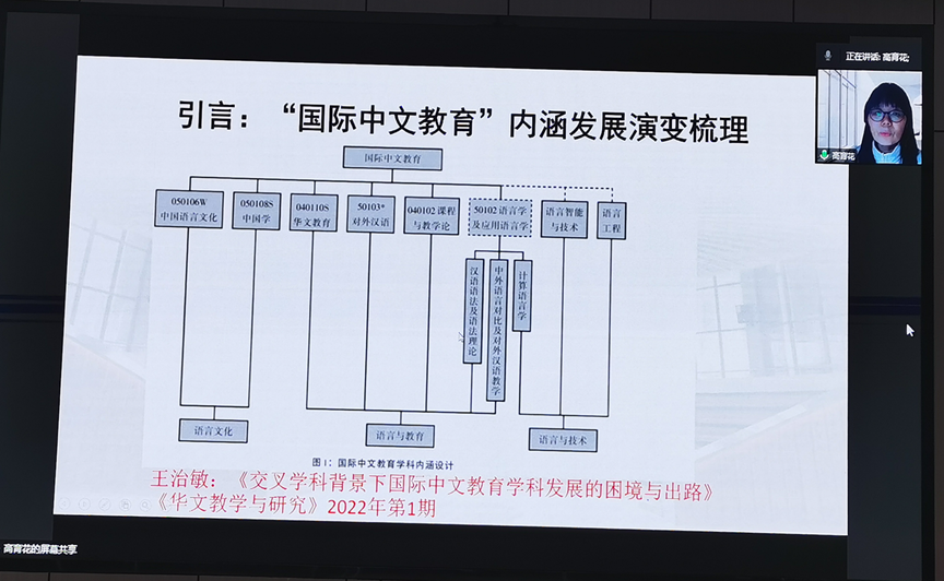 高老师首先就“国际中文教育”内涵发展演变进行了较为全面地梳理,认为国际中文教育指面向中文作为第二语言的学习者的教育,即既包括学界之前所说的“对外汉语教学”,也包括“国际汉语教育/教学”、“汉语国际教育”。之后,高老师结合北京外国语大学的太阳集团的情况,分享了汉语国际教育本科、硕士、博士的课程设置及太阳集团等方面的工作经验。