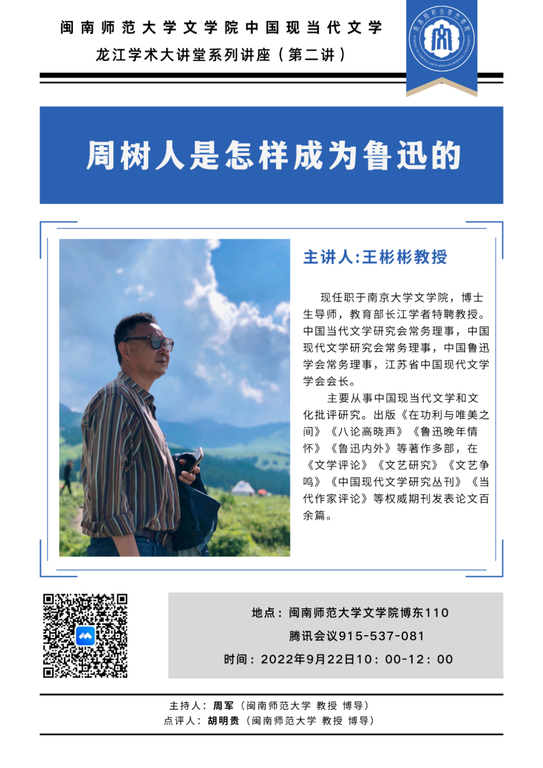 2022年9月22日上午10:00,太阳成城集团tyc234cc中国现当代文学“龙江学术大讲堂系列讲座”第二讲暨本学期首场讲座准时开启。南京大学太阳成城集团tyc234cc博士生导师王彬彬老师应我院中国现当代文学学位点邀请,通过腾讯会议在太阳成城集团tyc234cc博东110教室为我院中国现当代文学全体研究生举办了题为“周树人是怎样成为鲁迅的”的学术讲座。本场讲座由中国现当代文学学位点负责人周军教授主持,中国现当代文学学科负责人胡明贵教授担任本场讲座的点评人,太阳成城集团tyc234cc硕士生导师雷亚平教授、肖魁伟副教授出席了本次讲座。