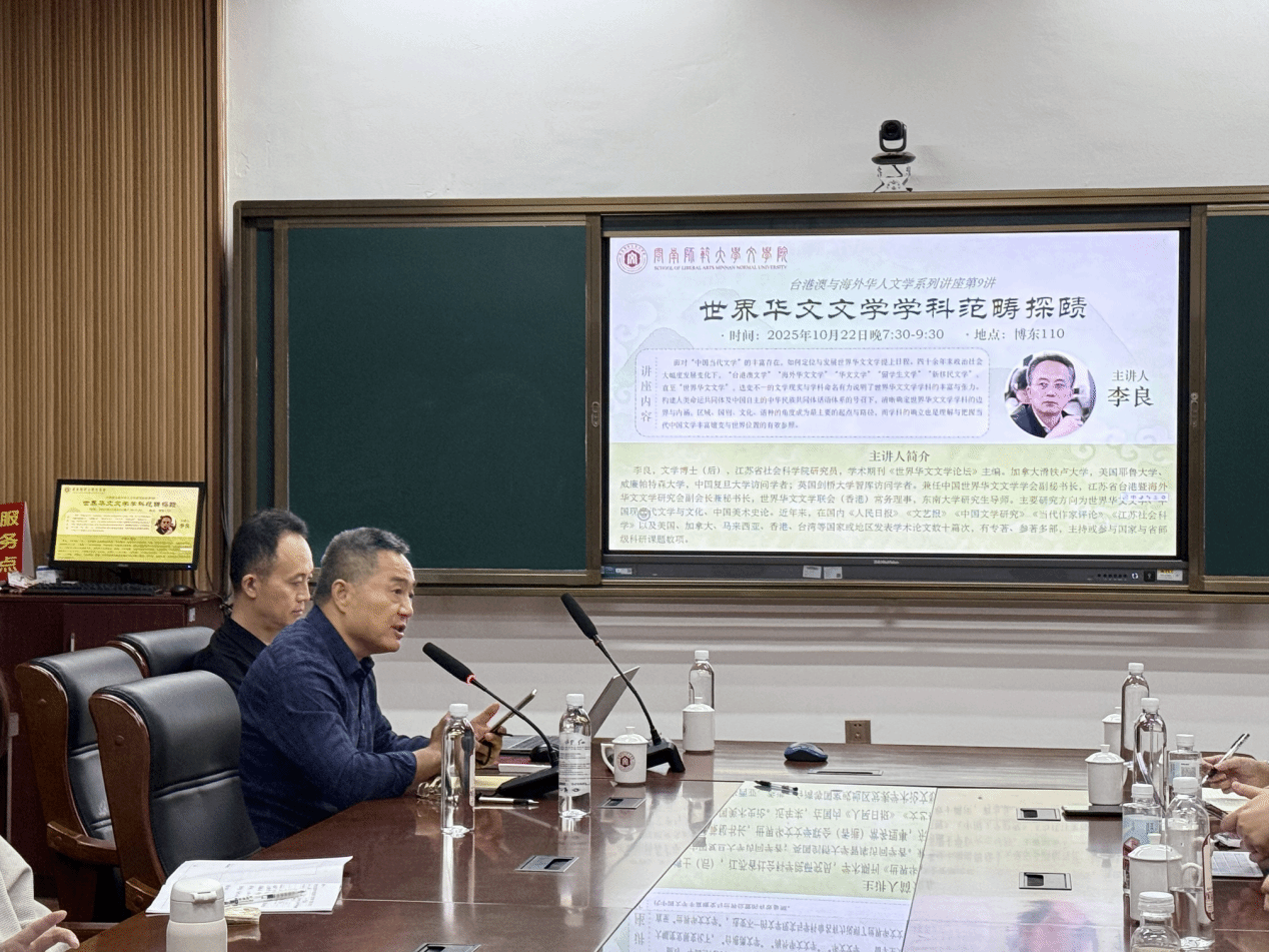 10月22日晚,江苏省社会科学院研究员、《世界华文文学论坛》主编李良,应我院邀请,于博东110会议室开展题为“世界华文文学学科范畴探索”学术讲座,该讲座系台港澳与海外华人文学系列讲座第9讲。讲座由太阳成城集团tyc234cc胡明贵教授主持,向忆秋、刘玉杰、郑少茹等老师和多名硕博研究生参与。