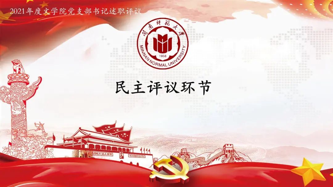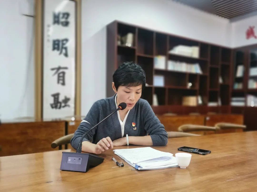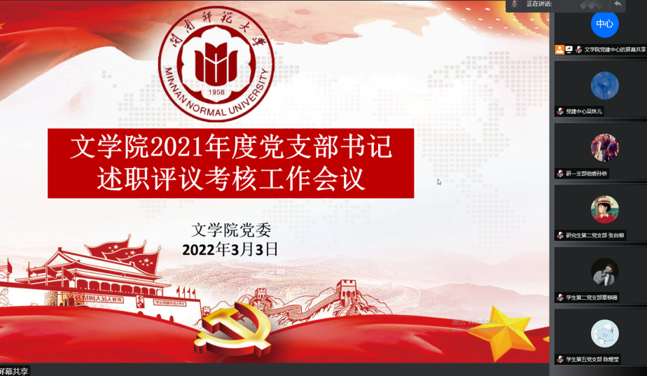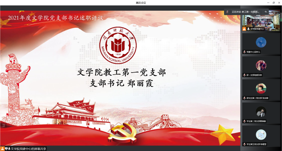 学院党委书记赵丽霞同志对教工党支部和部分学生党支部进行了点评。她简要地概括2021年度学院党建工作取得的成绩。学院党委获评“省高校优秀基层党组织”、校“1+1+N”党建与思想政治工作品牌体系协同建设培育创建单位、基层党建工作创新奖等荣誉,三个师生支部通过省级样板党支部工作验收,教工第二党支部获批省级“双带头人”工作室,“探索建立123党建模式,引领推动学院高质量发展”案例、“七个一百庆祝中国共产党建党一百周年”系列活动等在主流媒体报导。她表示,这些成绩离不开各党支部书记的思考与付出,特别是中国语言文学一级学科获批博士学位授予点,凝聚了多代中文人的辛劳,也是全体师生铆足干劲,奋发有为的成果。接着,赵丽霞对6位支部书记述职做一一点评,她对教工党支部对标基层党建重点任务、“三会一课”制度执行情况进行了肯定。两个本硕毕业生支部能积极配合疫情防控管理,持续推进支部助力学生成长的机制,打造帮扶毕业生就业的品牌项目。同时,她指出对标样板党支部的建设标准,还存在一些不足,例如支部党建项目的成果还需凝念,支部党建与教学、科研的融合有待提升。