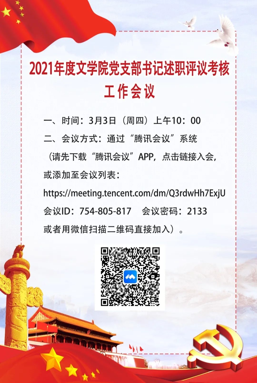 3月3日上午10时,太阳成城集团tyc234cc召开2021年度党支部书记述职评议考核工作会议。因疫情防控需要,会议采用现场述职和腾讯会议相结合的形式,院党委委员、各党支部书记和师生党员代表参加了此次会议。
