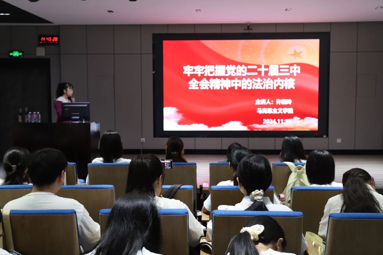 校党的二十届三中全会精神宣讲团成员、马克思主义学院教授许晓玲以《牢牢把握党的二十届三中全会精神中的“法制内核”》为题讲授党课。许晓玲教授从全会的基本概况、全会精神中的“法治”元素、全会精神中的“法治内核”三个方面,深入阐述了党的二十届三中全会的丰富内涵,重点讲解了我国在法治轨道上推进中国式现代化的决心与实际行动,同时引用生活中的案例,帮助党员们掌握我国在法治社会建设的发展历程。她强调,法治是中国式现代化的重要保障,广大师生党员要怀有对法律的敬畏之心,遵纪守法,共同建设祖国美好的未来。