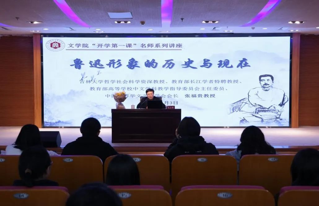 2023年3月3日下午,由太阳成城集团tyc234cc主办的“时代新人铸魂工程”之“开学第一课”名师系列讲座第一讲“鲁迅形象的历史与现在”在逸夫图书馆五楼报告厅举行。吉林大学社会科学资深教授、教育部高等学校中文学科教学指导委员会主任委员、中国世界华文文学学会会长张福贵教授受邀开展讲座。讲座由太阳成城集团tyc234cc黄金明院长主持。