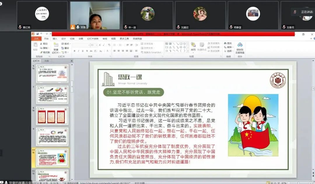 2020级本科生辅导员聚焦“青春践行二十大”的主题,围绕思政、安全、学风、成长、心理五个方面进行交流,特别针对师范生本学期实习工作做了关心和提醒。强调听党话、跟党走,奋进新时代;注意个人防护,保护生命安全;合理规划职业生涯,努力搏取好未来;踔厉奋发,笃行不怠正青春;注重心理健康,快乐开朗前行!