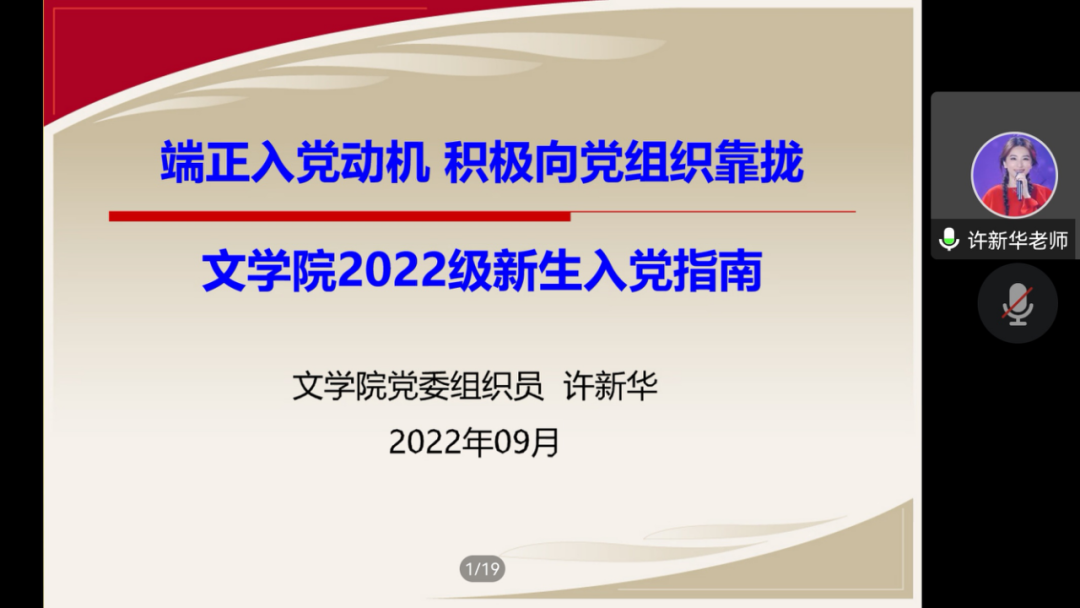 9月18日上午,太阳成城集团tyc234cc党委组织员许新华老师为22级新生做入党指南宣讲。本次的宣讲主题是“端正入党动机 积极向党组织靠拢”。许新华老师首先对中国共产党的性质、宗旨,党员的权利、义务以及党的最新理论成果习近平新时代中国特色社会主义思想进行简要介绍。许新华老师从“发展党员的政治标准”和“入党程序”两个方面做详细解读。发展党员把政治标准放在首位,大学生要端正入党动机,树立共产主义信念,践行全心全意为人民服务的宗旨,认真学习习近平新时代中国特色社会主义思想,争取早日在组织上、思想上入党。许新华老师详细介绍了入党的5个阶段、25个具体程序,强调入党具有严格的程序,每一个流程都会考察申请人在思想、政治、学习、工作、生活等各方面的表现。最后,许新华老师详细讲解如何写好入党申请书,并对与会学生的入党问题进行解答。本次宣讲对加强新生对党的认识、吸引优秀学生积极向党组织靠拢具有重要意义。