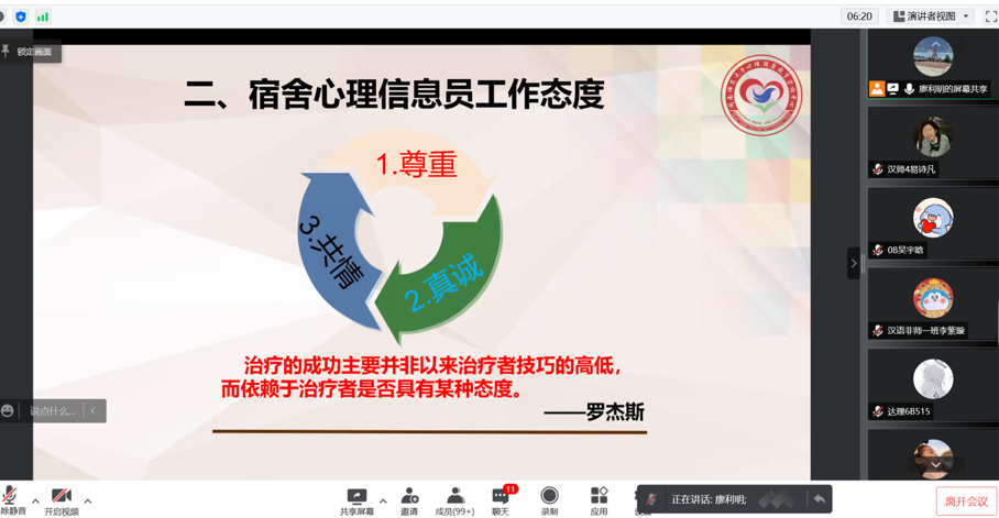 廖利明就当前新冠疫情防控背景,从宿舍心理信息员自助、助人能力提升出发,指出了维护和谐友爱的宿舍人际关系的重要性;从心理健康教育咨询中心“助人自助”的工作理念出发,介绍了宿舍心理信息员所需的工作态度、基本技巧及专注与倾听等素质要求,强调了朋辈辅导员的辅导目的、有效核心。
