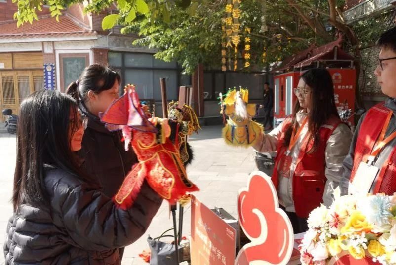 真武庙的非遗游园会上,布袋木偶戏的摊位前热闹非凡。在这里,实践队初次体验布袋木偶的操作。布袋木偶在指尖舞动,仿佛已融入那个古老的故事世界中。游园会现场的志愿者与实践队分享了许多布袋木偶戏的有趣故事和传承的艰辛。一生只为一事来,一心只待一花开,他们是非遗技艺的传承者,用热情和坚持守护着这份非遗文化,热爱不止而匠心永存。