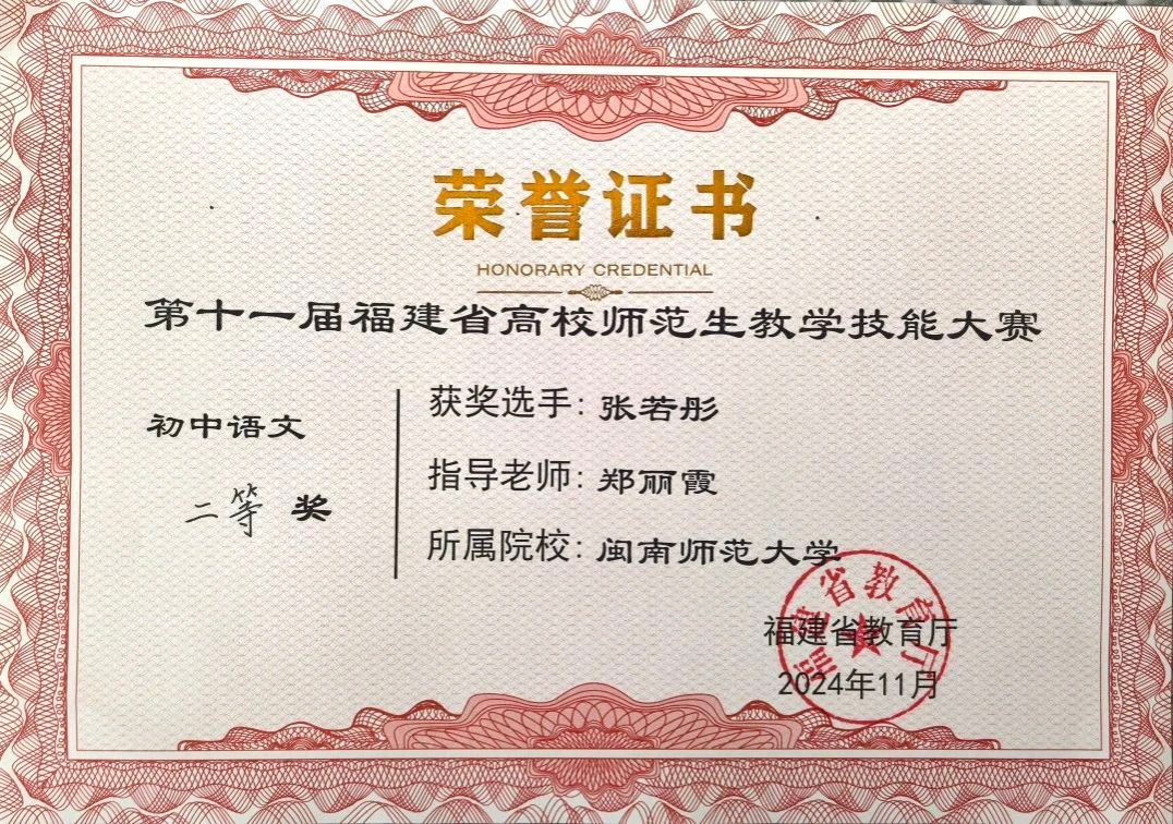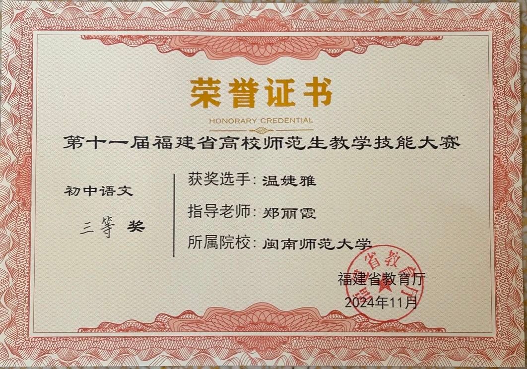 2024年11月15日至16日,由福建省教育厅主办的第十一届福建省高校师范生教学技能大赛在泉州师范学院举办。本次大赛,我院3名2021级师范生与来自全省39所高校选手展开激烈的竞争与角逐,并最终获得1个一等奖、1个二等奖和1个三等奖的优异成绩。21师本6班彭辰煜以91.067分的优异成绩荣登榜首,喜获初中语文组一等奖(第一名),21师本3班张若彤获初中语文组二等奖、21师本5班温婕雅获三等奖。指导教师郑丽霞连续两届获评“优秀指导教师”。