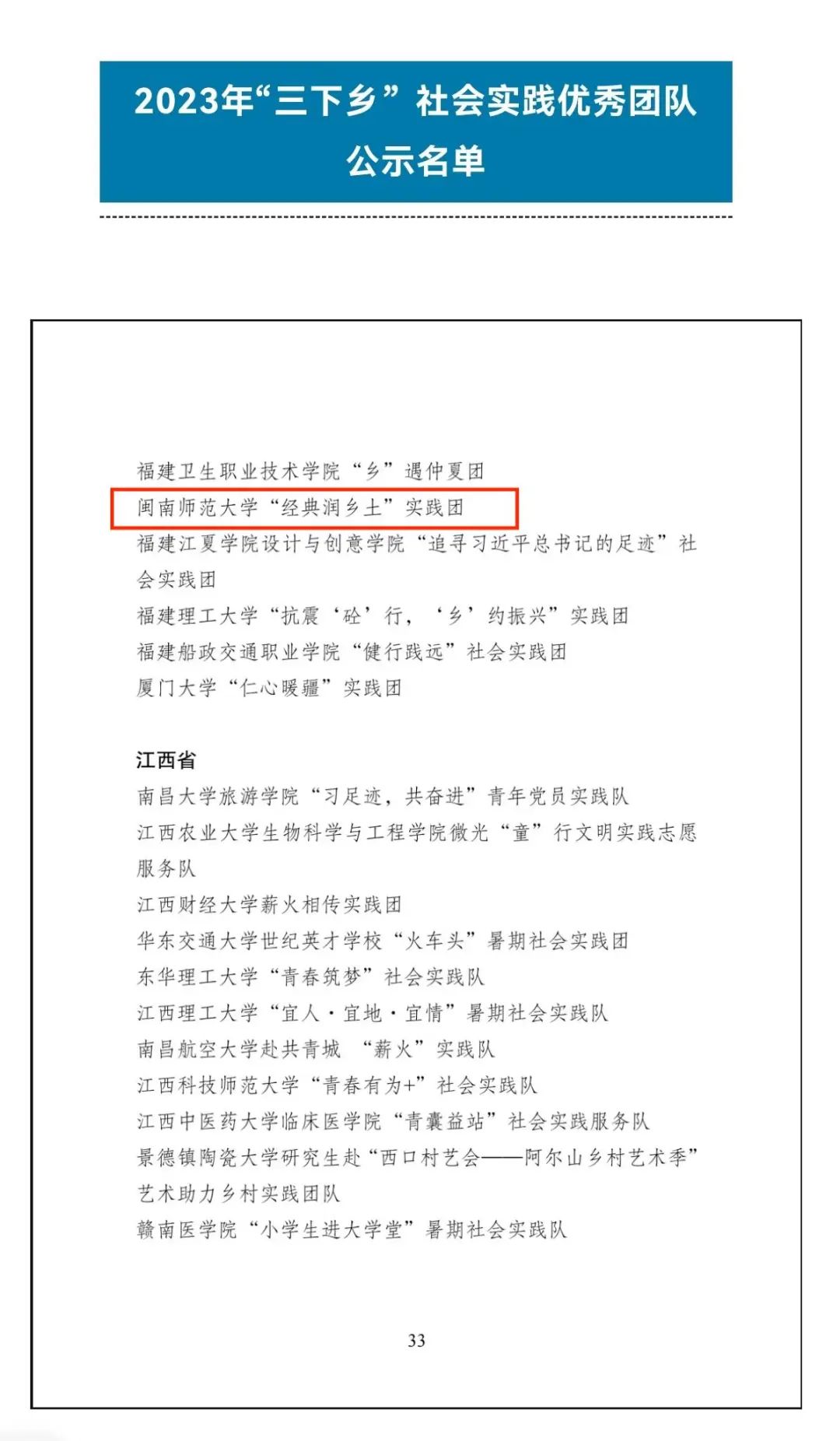 近日,共青团中央公布2023年暑期文化科技卫生“三下乡“社会实践活动优秀团队名单,经基层申报、省级团委审核推荐、组织评议等环节,太阳成城集团tyc234cc“经典润乡土”推普助力乡村振兴实践团队荣获2023年全国”三下乡“社会实践优秀团队。