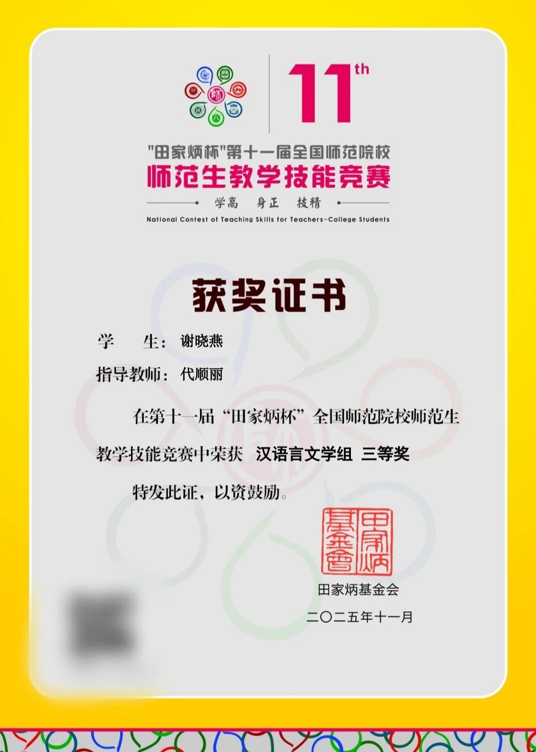 近日,第十一届“田家炳杯”全国师范院校师范生教学技能大赛落下帷幕。我院代顺丽教授指导的2022级本科生谢晓燕同学在本次竞赛中荣获三等奖。