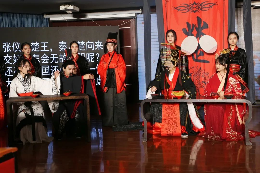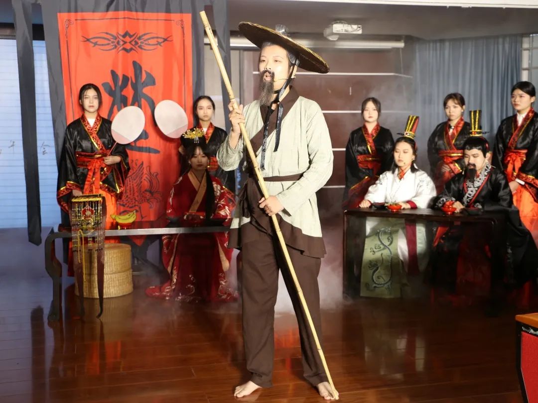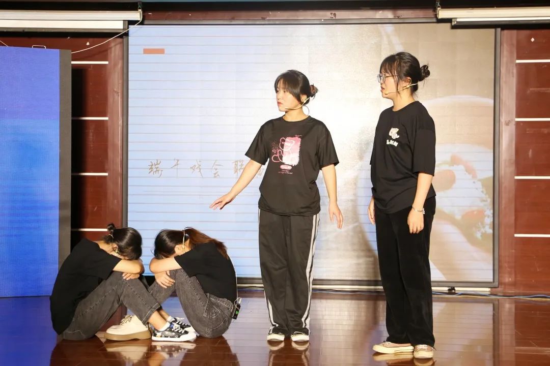 端阳戏剧联演分为《时间和旅人》与《九逝——平原怀江》两出。《时间和旅人》改编自洪琼君老师原创绘本,五位同学生动地演绎了在奇妙的冒险世界中,一位旅人以爱之名唤醒整个鸟儿国度并赢得佳人同归的故事。《九逝——平原怀江》(端午特别版)讲述了屈原立志报国却遭奸人陷害最后投江明志的经历,以戏剧的形式回溯端午节由来,告诫今人勿忘屈子“逆流”精神。