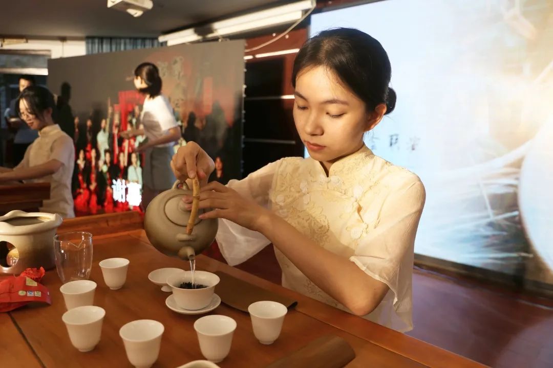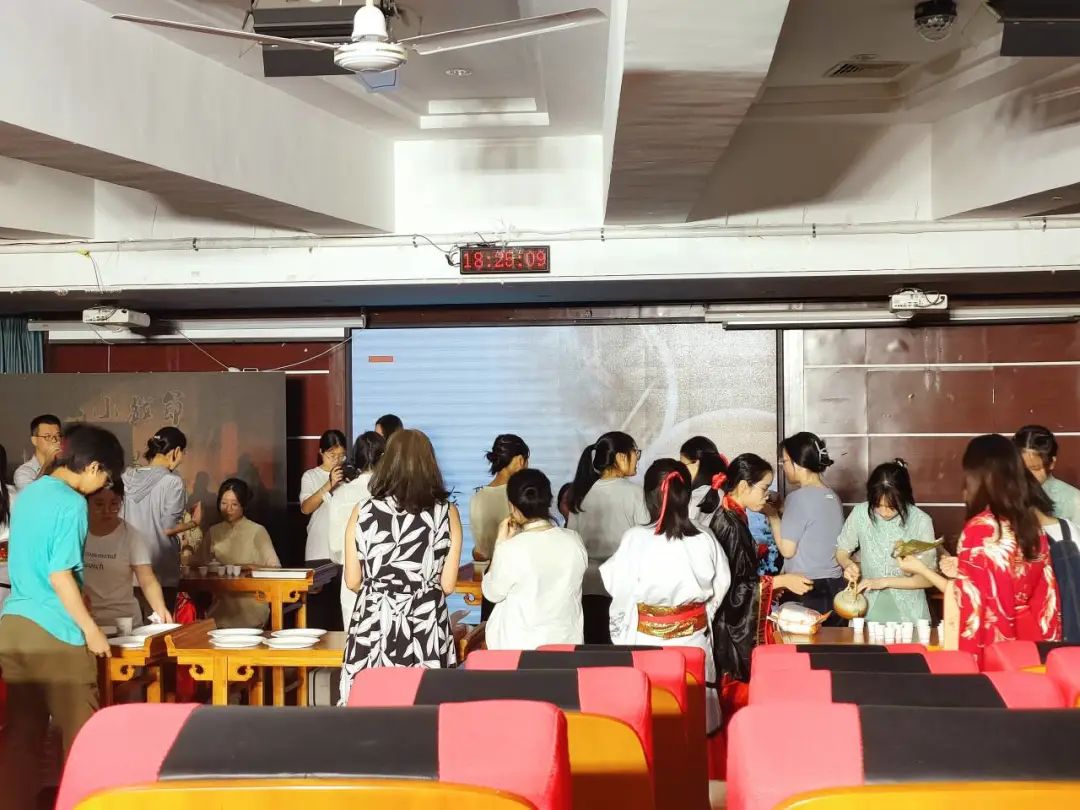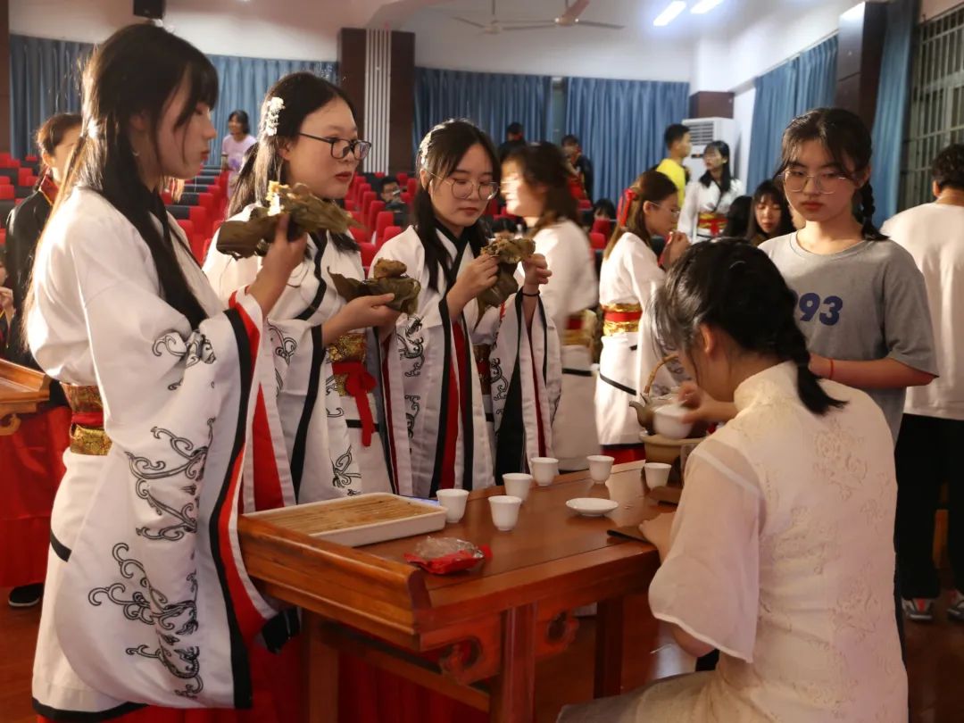 随后,端阳宴开席。云水茶艺协会表演茶艺,师生齐聚一堂,品茶吃粽谈心。