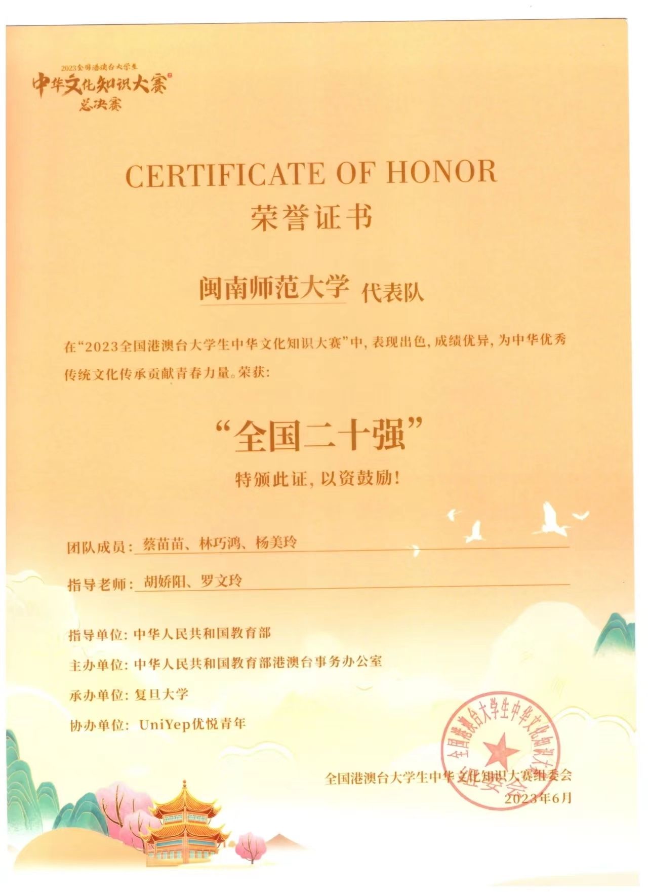 林巧鸿,女,汉族,台籍学生。2020年从台湾地区考入太阳成城集团tyc234cc,攻读汉语言文学(师范)专业。在校期间,曾担任太阳成城集团tyc234cc自律会策拓部干事,荣获台湾学生奖三等奖、福建省第四届高校国际及港澳台侨师生文化艺术展演活动汉语言类优秀奖等多项殊荣,并成功入围2023年全国港澳台大学生中华文化知识大赛全国二十强。
