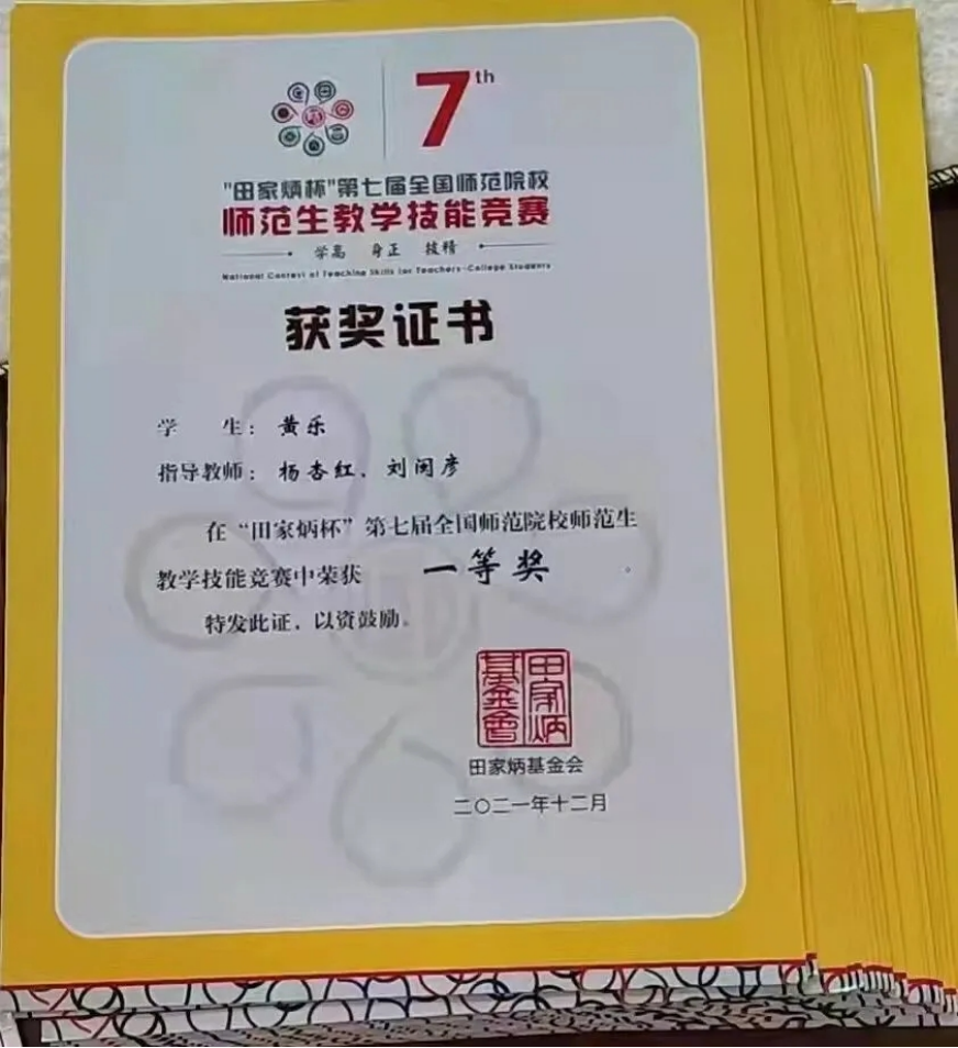 校教师技能竞赛中,我获得第五名,这是对我这三个月努力的认可,同时也是“田家炳杯”全国师范生教学技能竞赛初赛的入场券。国赛,没有前人经验总结与铺垫,杏红老师便领着我在这陌生的领域慢慢摸索,拜访一线名师、参考学院教师的文本分析、精心打磨教案、邀请专业团队录制视频,整个过程老师一直引导着我、支持着我、鼓励着我。初赛的成绩十分令人惊喜,全国147所学校890多名选手参赛,我以语文组第六名的成绩“高位出道”。但,欢欣与喜悦没有持续很久,我不由得让为决赛紧张起来。可能“爱笑的人运气不会特别差”。决赛赛制的改变,让我能够做出更充分的准备。线上抽题,线下录制,投递视频参赛。两天的时间,各方的支持,杏红老师、闽彦老师等老师细致入微的指导,伙伴朋友们的场外的支持与帮助,让我在决赛录制那天能够一往无前,心无旁骛。