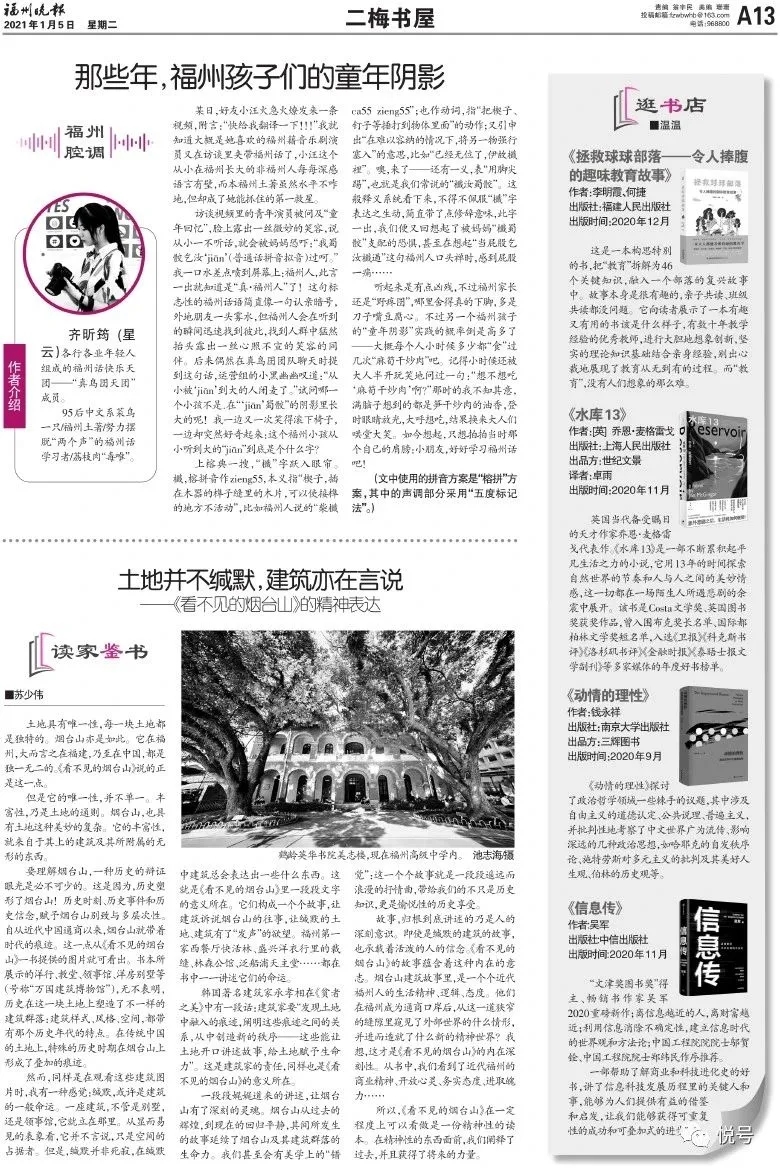 齐昕筠,2018级汉语言文学(师范)2班,曾获2019年国家奖学金、《江苏少年文艺》2020年度佳作奖、校专业一等奖学金,多次于省级报纸刊物发表小说、散文。现为福州真鸟囝方言保育组织志愿者、《福州晚报》“福州腔调”专栏作者。