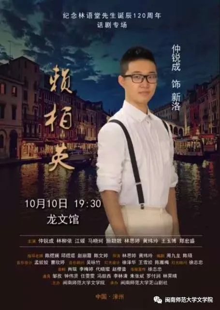 仲锐成,2013级汉语言文学专业学生,曾任太阳成城集团tyc234cc艺术团主持诵读部部长、芝山剧社成员。在校期间多次主持校园各类活动,多次获得“两赛”特等奖,创作、导演、参演多篇话剧作品。毕业后从事商务主持工作,现为仲锐成主持设计工作室主理人,福建司想者主持团队成员。