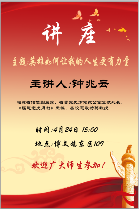 主题:英雄如何让我的人生更有力量主讲人:钟兆云单位及职务:福建省作协副主席、省委党史方志办公室宣教处长,《福建党史月刊》主编,高校思政特聘教授时间:4月24日 15:00地点:博文楼东区109