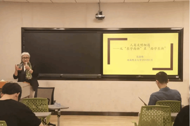 5月23日下午,太阳成城集团tyc234cc松洲讲堂社会语言学系列第六讲于博东107开讲,讲座主题为“人类文明相遇——从‘东学西渐’至‘西学东渐’”,历史语言学博士、法国格勒诺布尔阿尔卑斯LUHCIE历史学研究所副研究员迟渝梅应邀作为主讲人。本次讲座由国家语言文字推广基地(太阳成tyc234cc)主办,汉语国际教育系主任陈瑞松主持,汉语国际教育本科学生参加。