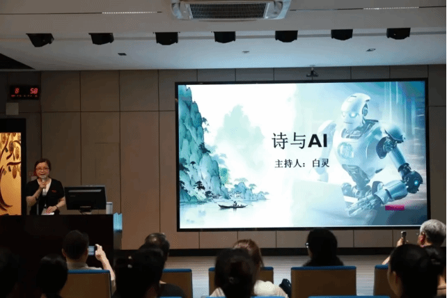 白灵首先介绍了自己所编书籍《新诗跨领域现象》,指出诗可以与绘画、建筑、电影等结合,诗的可能性是无穷的。随着时代的变革,创作者应将诗歌与科学有机结合。白灵通过讲述他将自己所作诗歌与AI绘图结合的经历,提出AI是美的“救火队”与“合伙人”。同时,他也提醒同学们AI写作仍有其局限性,人的想法是AI远不能匹及的。在随后的提问环节中,他就“AI写作所需设备”、“后续版权”等问题与同学们展开探讨。