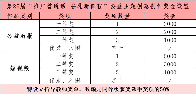 为更好宣传推广推普周,推普周宣传海报和公益广告执行单位中国教育电视台携手中国大学生广告艺术节学院奖 · 益青春公益行动,向全国青年发起“第26届推普周:推广普通话 奋进新征程”的公益创作邀约,深入宣传国家语言文字法规政策,积极引导当代青年树立科学的语言观,通过青年向社会、家庭辐射传播“说好普通话”“推广普通话”的意识和行动,为传承弘扬中华优秀语言文化贡献青年力量。