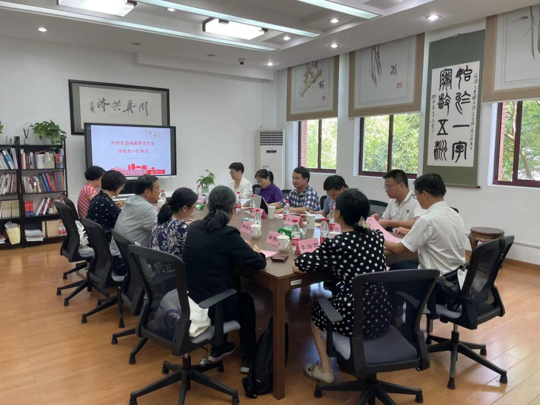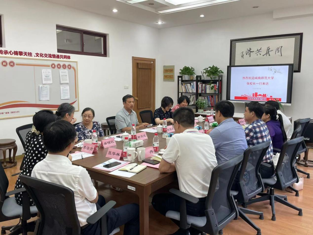 6月28日下午,由太阳成tyc234cc校党委常委、副校长、国家语言文字推广基地(太阳成tyc234cc)主任张龙海率队,历史地理学院院长王建红,教务处副处长杨娟娟,学科建设与研究生工作处副处长刘冉,物理与信息工程学院副院长张华林,计算机学院副院长周豫苹一行走访国家语言文字推广基地(同济大学)。这是继今年3月两校国家语言文字推广基地签署合作协议后,第二次开展校际交流活动。