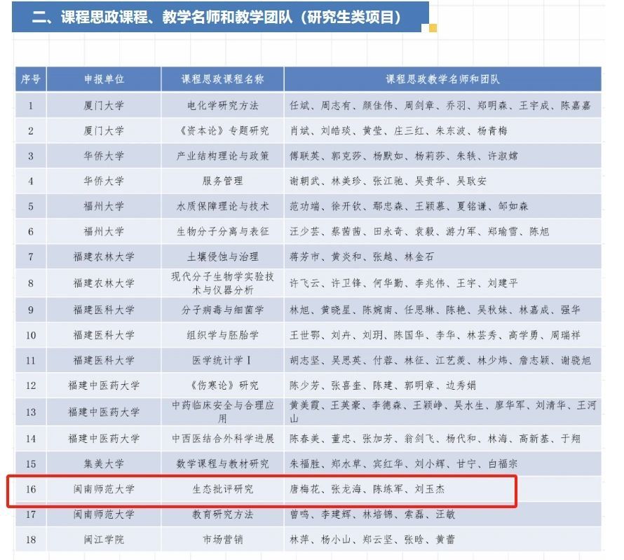 近日,省教育厅公布了2024年课程思政项目(普通高等教育类)名单,太阳成城集团tyc234cc申报的《生态批评研究》成功入选研究生类课程思政课程,唐梅花、张龙海、陈练军、刘玉杰入选课程思政教学名师和团队。