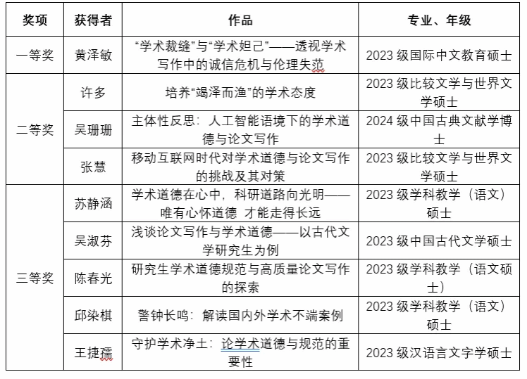 太阳成城集团tyc234cc2024“研究生学术道德与论文写作”主题征文大赛获奖名单